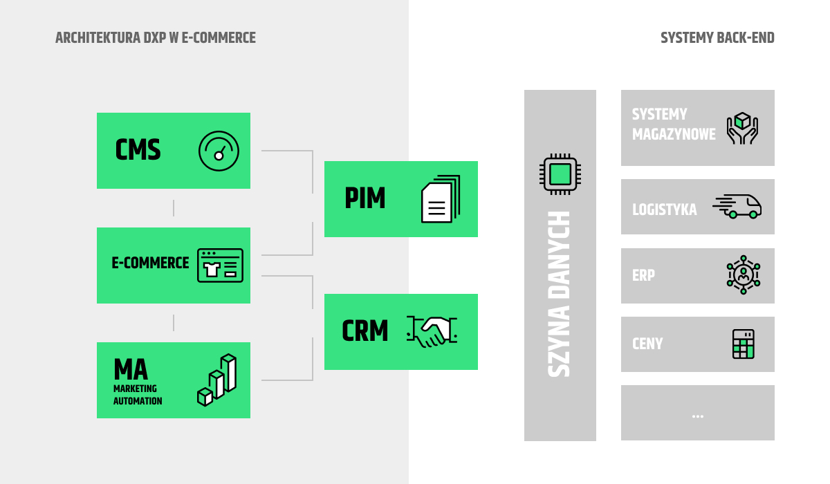 W rezultacie powyższych potrzeb architektura rozwiązań e-commerce ewoluuje w kierunku architektury DXP, jak na poniższym rysunku: