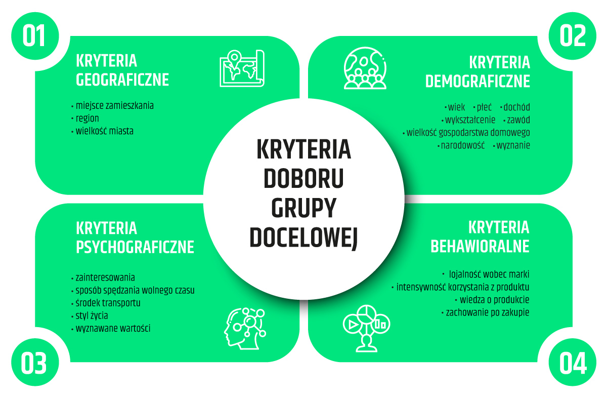 W określeniu grupy docelowej możesz posłużyć się kryteriami geograficznymi, demograficznymi, psychograficznymi i behawioralnymi.