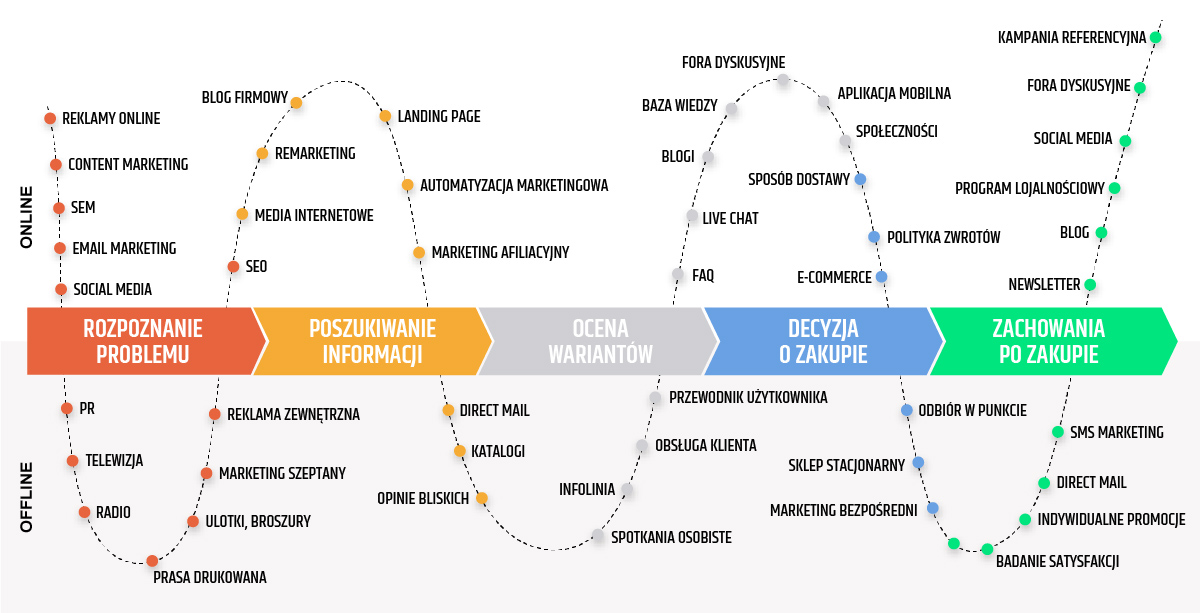 Przykładowe touchpointy na 5 głównych etapach customer journey