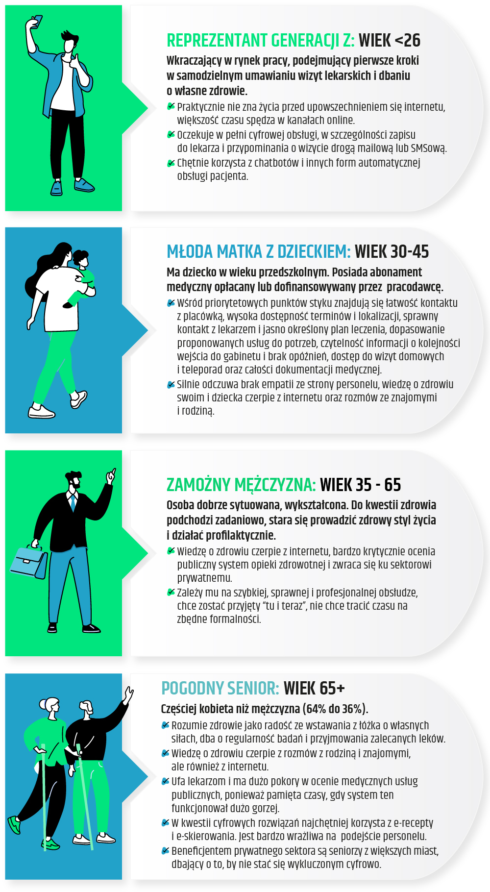 Wszystkie opisane wyżej persony łączy rosnąca świadomość wygody i efektywności usług cyfrowych. Poza rozwiązaniami digitalowymi pacjenci zwracają także uwagę na czynniki takie jak: