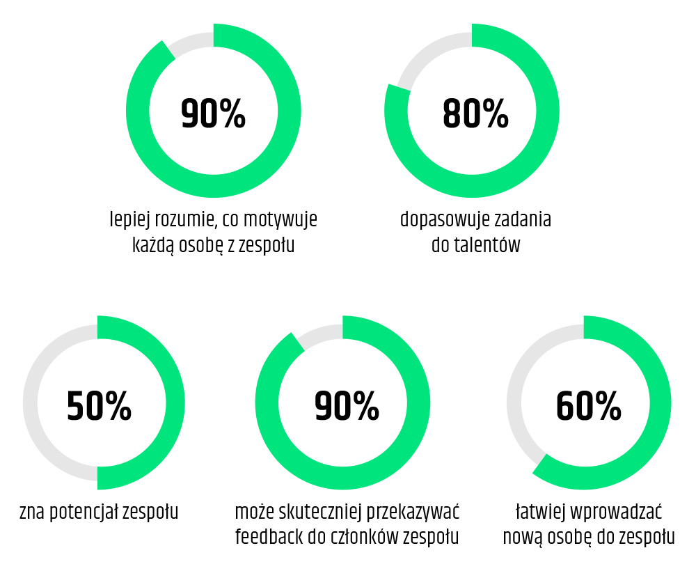 Osoby znające i wykorzystujące w pracy własne talenty są 6 x bardziej zaangażowane, a zespoły skoncentrowane na mocnych stronach mają o 12,5% większą produktywność. Dlatego od tej pory wykorzystujemy badanie CliftonStrengths i ideę zarządzania opartego na mocnych stronach.