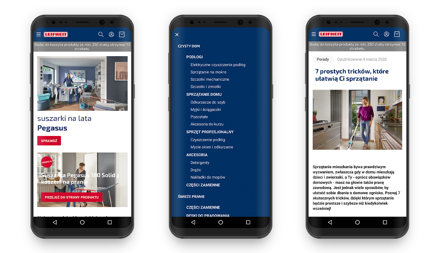 We wcześniejszym etapie współpracy zoptymalizowaliśmy sklep Leifheit pod kątem doświadczeń użytkowników mobilnych przez redesign oraz implementację Progressive Web Application. PWA to standard tworzenia stron internetowych oraz zestaw rozwiązań technologicznych, dzięki którym strona www zachowuje jak natywna aplikacja.
