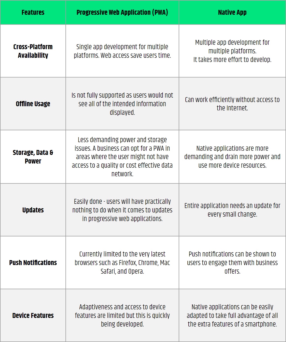 Native applications are easily able to adapt and take advantage of all the extra features of a smartphone. However, this feature is not that enhanced when it comes to progressive web applications. This simple comparison table makes it easy to evaluate the benefits of the right choice of application for your business.