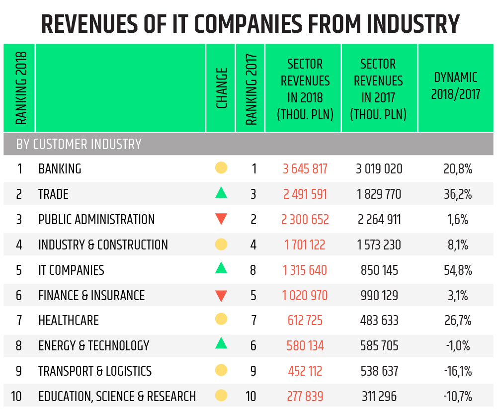 Taking into account the common trend towards digitization, such a small difference between the growth of the IT industry and the rest of the economy leaves a feeling of insufficiency. On the other hand, it can be a good sign for the future - there is still space for further growth. This is confirmed by the results in the banking and trade sectors, industries often associated with digital transformation. They were the main clients of IT solutions.