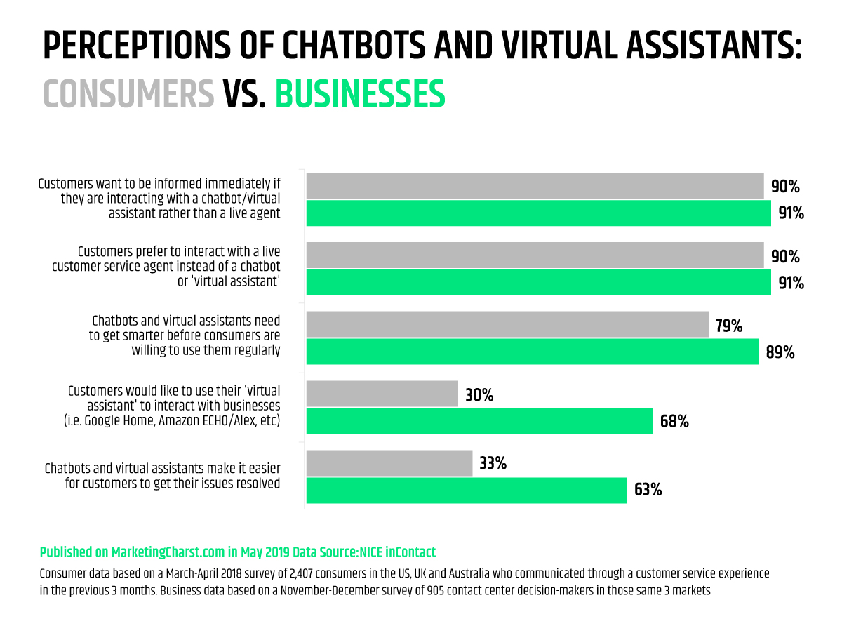 The chart below from MarketingCharts.com clearly demonstrates much of the skepticism surrounding the use of AI in customer services. It all boils down to the fact that a resounding 9 out of 10 businesses and consumers say that customers still prefer to to be served by human beings.