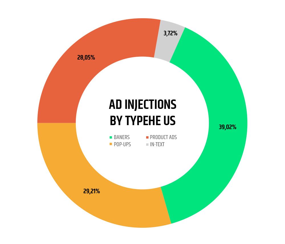 Thirty-nine percent of infected users were targeted with banner-ads while browsing a website, and annoying pop-ups were forcefully shown to 29.9% of the infected users. The other 28.05% were exposed to product ads and promotions.