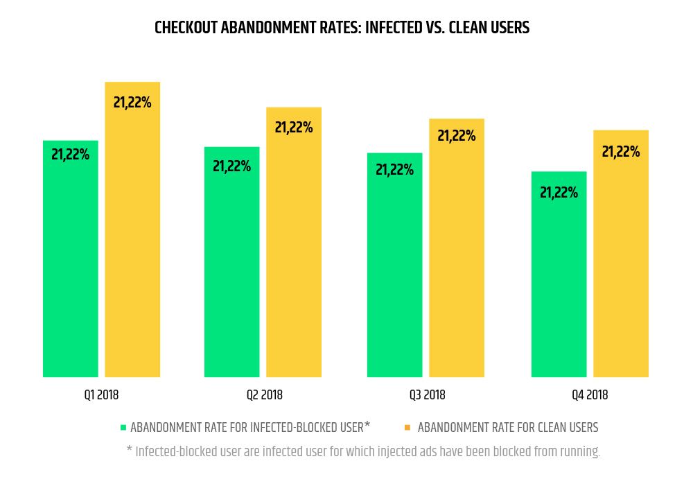 Abandonment rates for previously infected users versus clean users were lower across all four quarters. For example, in the first quarter, it was 56.68% for previously infected users and 70.99% for clean users. This shows that users for whom the infected ads were blocked, are less likely to abandon at checkout when compared to users from clean sessions.