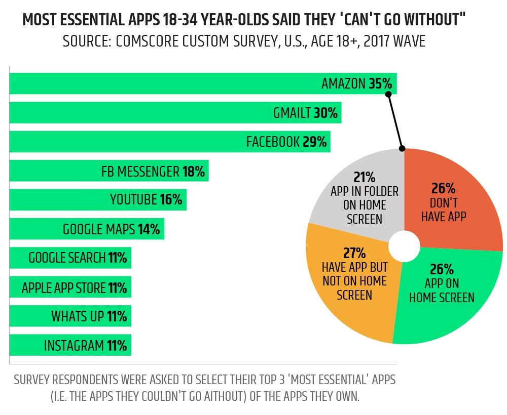 An average user has about 90 apps installed on his or her device but rarely uses more than 25 per month, spending 77% of the time using only three of them. In the case of millennials, that’s Amazon, Gmail, and Facebook.