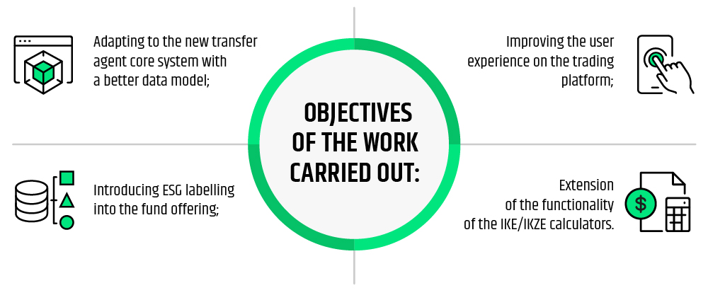 Thanks to many years of fruitful cooperation, the client regularly commissions us for further developments of their operating systems. We have categorised recent projects into three main areas: migration of the i-system, implementation of ESG targets, and extension of the IKE/IKZE calculator’s functionality.